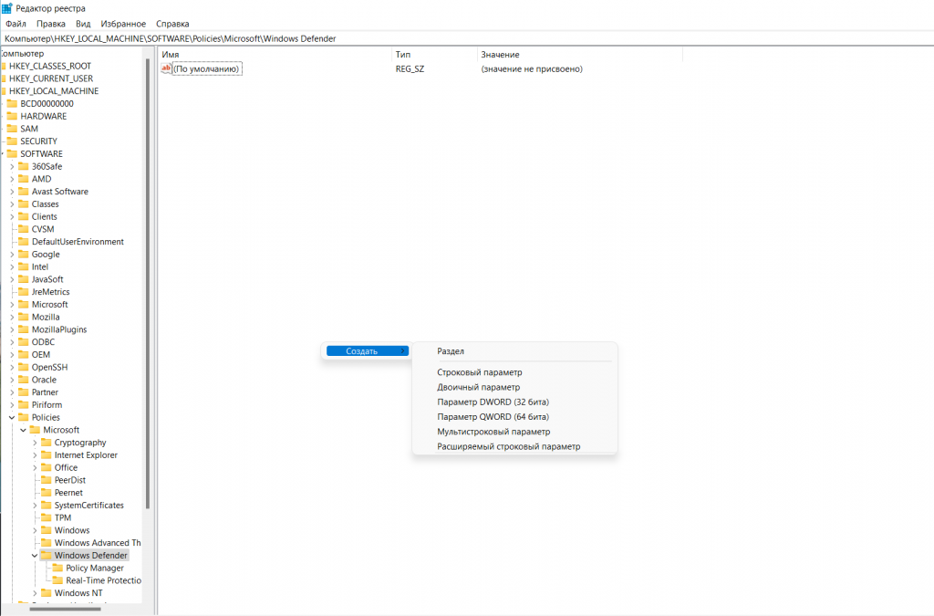 Компьютер\HKEY_LOCAL_MACHINE\SOFTWARE\Policies\Microsoft\Windows Defender