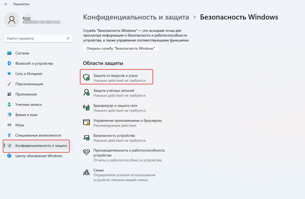 - Откройте «Параметры», далее: «Конфиденциальность и защита» → «Безопасность Windows» → «Защита от вирусов и угроз».