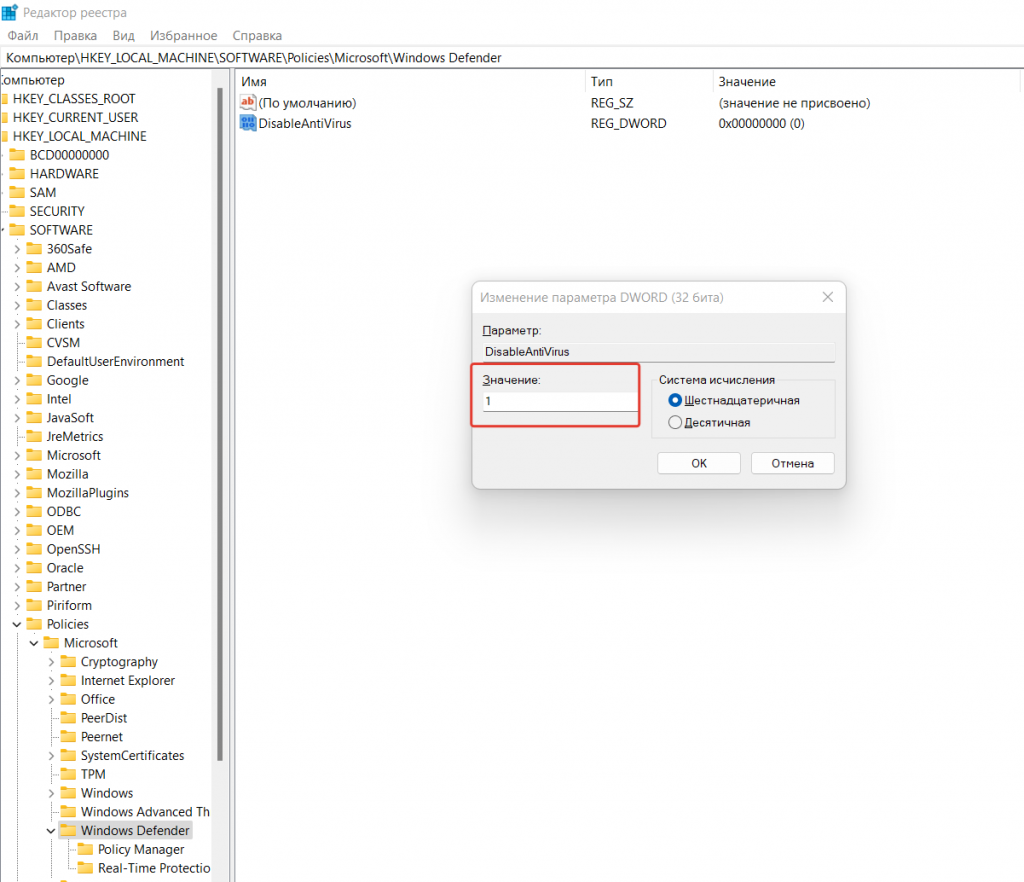 - Как только файл реестра появится в правом блоке окна, щелкните на него дважды и впишите значение «1», что будет означать включение отключения антивирусника Windows. Немного путанно, но точно отражает суть происходящего.
