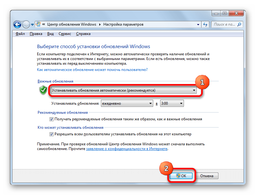В открывшемся окне в блоке «Важные обновления» переставляем переключатель в позицию «Устанавливать обновления автоматически (рекомендуется)». Щелкаем «OK».
