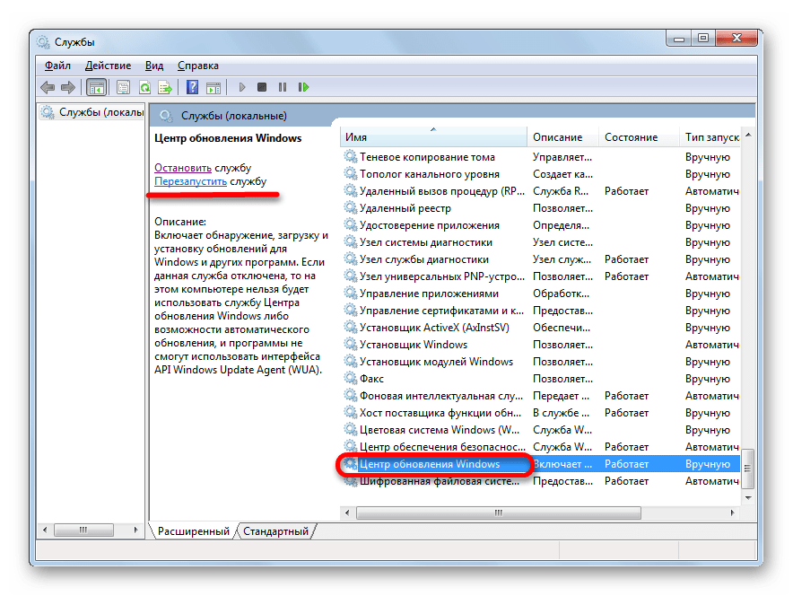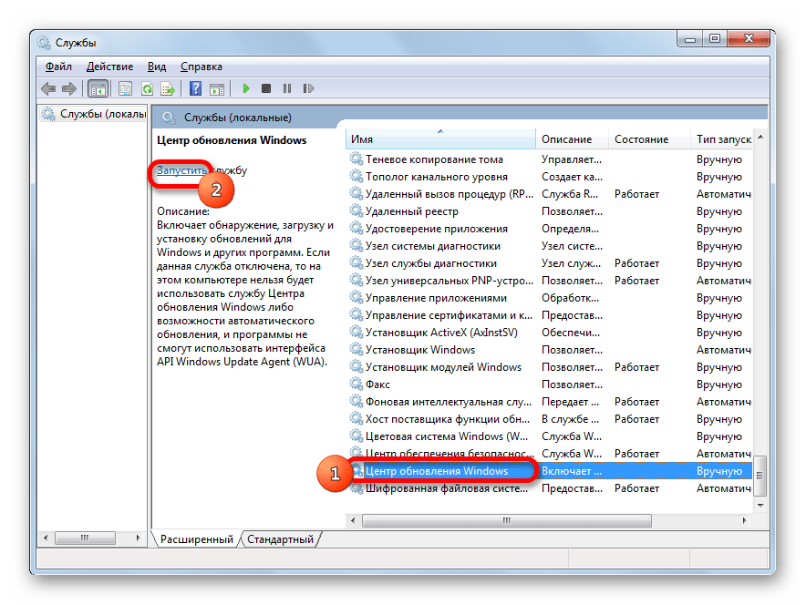 При любом из двух описанных вариантов действий (переход через Панель управления или окно «Выполнить») открывается Диспетчер служб. Ищем в перечне наименование «Центр обновления Windows» и отмечаем его. Если служба вообще не запущена, то следует её включить. Для этого щелкаем по наименованию «Запустить» в левой области окна.