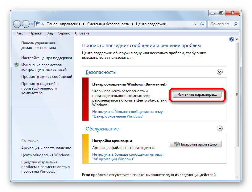 Если у вас отключена служба обновления, то в разделе «Безопасность» будет отображаться надпись «Центр обновления Windows (Внимание!)». Кликаем по находящейся в том же блоке по кнопке «Изменить параметры…».