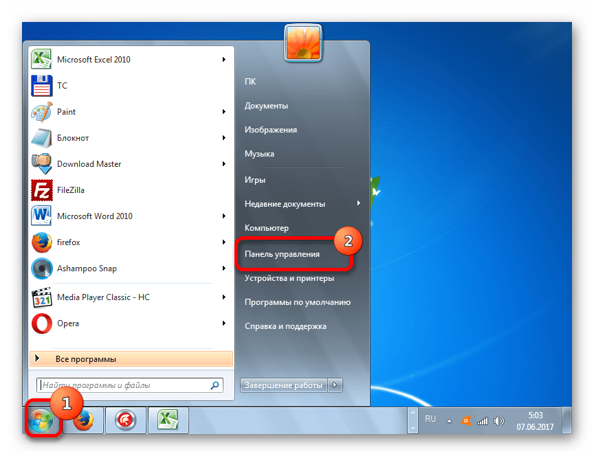 - Щелкаем по кнопке «Пуск» внизу экрана. В раскрывшемся меню переходим по позиции «Панель управления».