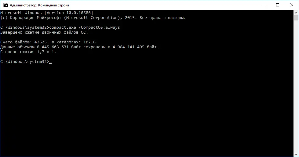 Запустите команду “compact.exe /CompactOS:always” чтобы выполнить сжатие бинарных файлов.
