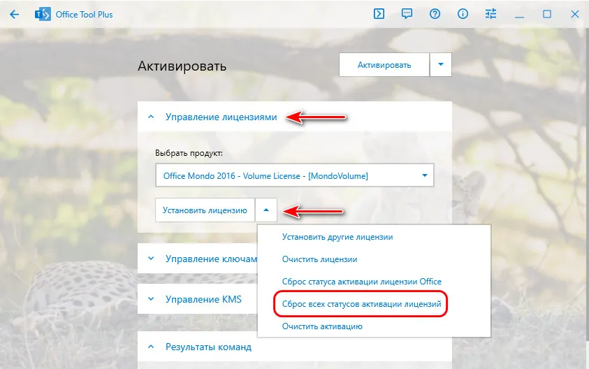 В блоке «Управление лицензиями» раскрываем выпадающий список «Установить лицензию» и жмём «Сброс всех статусов активации лицензий».