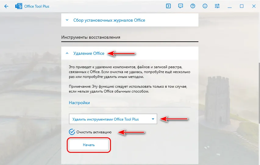В блоке «Удаление Office» оставьте значения по умолчанию «Удалить инструментами Office Tool Plus» и «Очистить активацию». Нажмите «Начать».