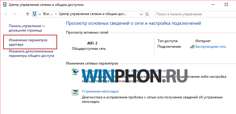 Далее потребуется раздать интернет траффик, поскольку только по команде заработает сеть. Для этого используем средства «Центра управления сетями и общем доступом» (находим знак компьютера в низу справа, рядом с часам), далее в окне нажимаем слева «Изменение параметров сети/адаптера».