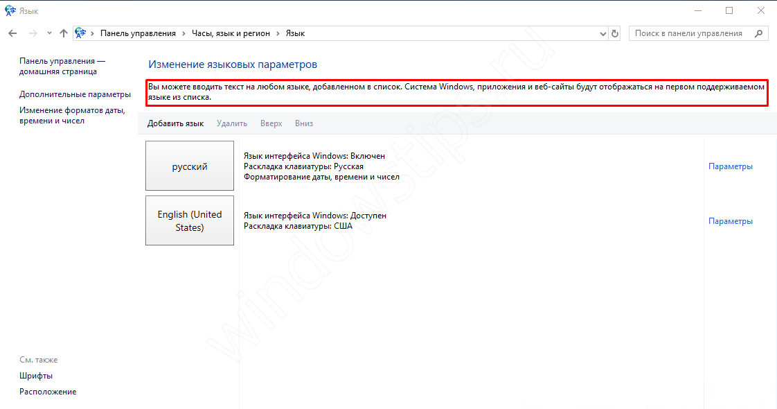 Стоит обратить внимание на строчку «Приложения и веб-сайты будут отображаться на первом поддерживаемом языке из списка». Чтобы изменить язык приложений в Windows 10 , нужно лишь выставить нужное значение на первое место