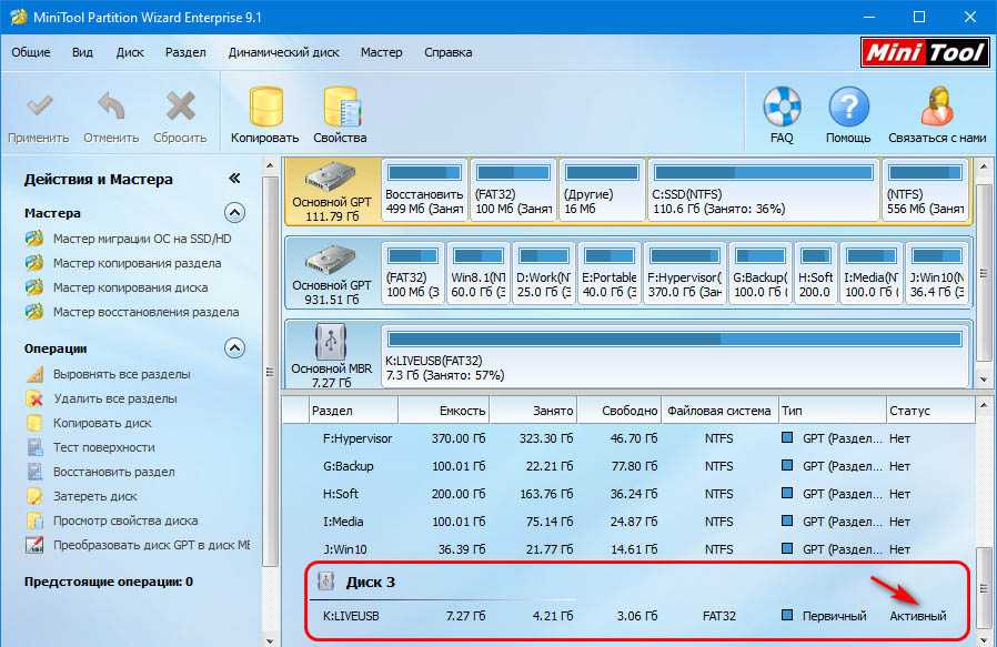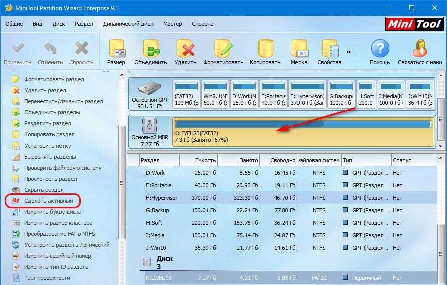 Но чтобы она подходила ещё и для режима Legacy, нужно адаптировать её. Для этого нам понадобится любая функциональная программа для разметки дискового пространства. В нашем случае мы будем использовать одну из старых версий MiniTool Partition Wizard. В окне программы смотрим карту нашей флешки и её табличное представление. Стиль разметки флешки у нас верный – MBR. Раздел флешки — первичный (основной), всё верно. А вот статуса активного этот раздел не имеет.