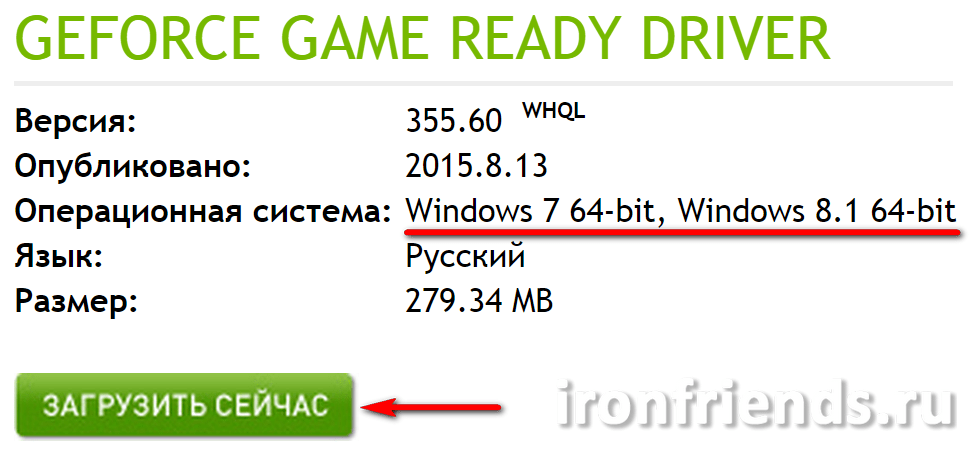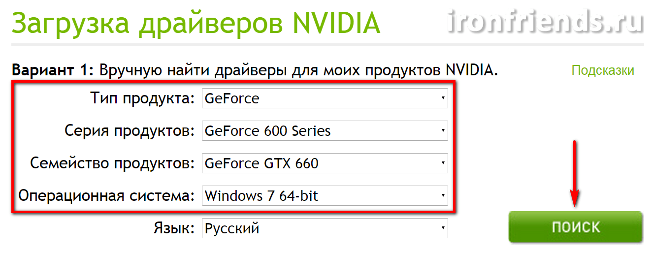 Если у вас видеокарта GeForce, то зайдите в раздел загрузки драйверов на сайте nVidia, укажите модель вашей видеокарты, версию Windows и нажмите кнопку «ПОИСК».