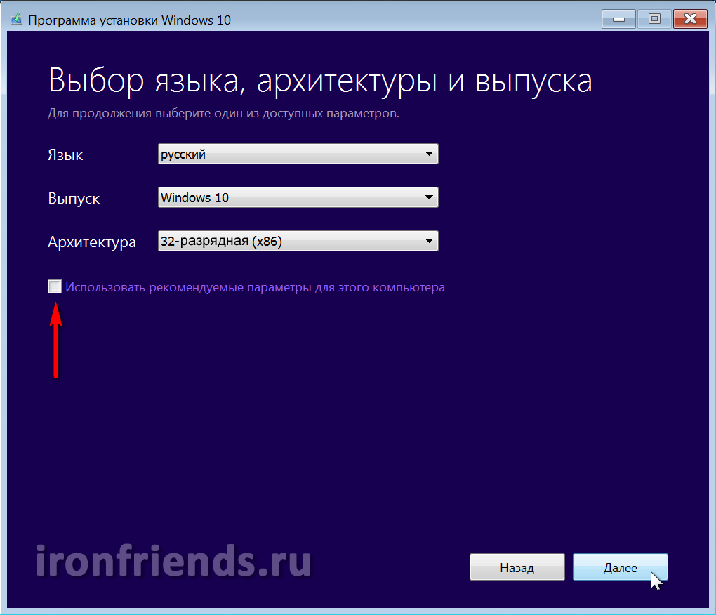 Снимите галочку «Использовать рекомендуемые параметры» и после этого можно будет выбрать выпуск и архитектуру операционной системы.