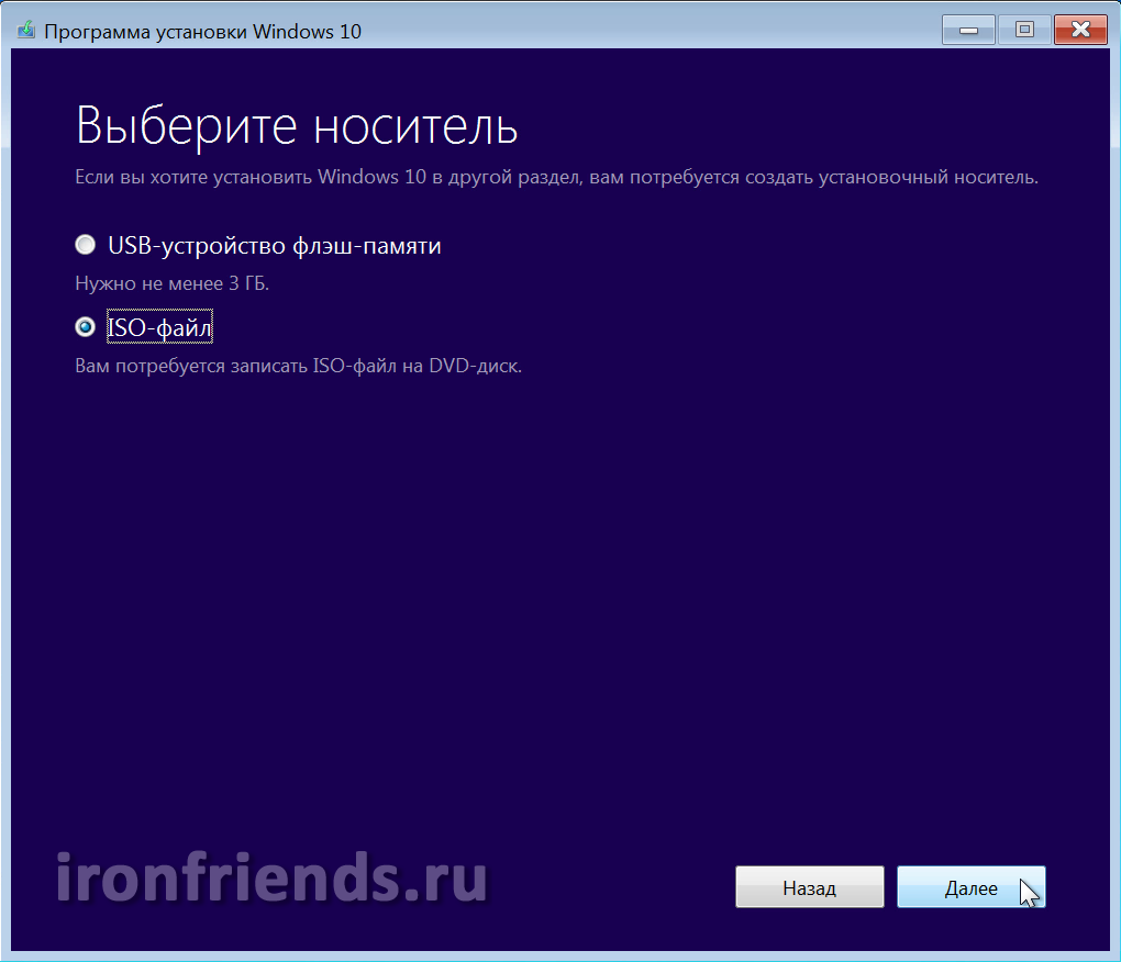 В следующем окне предлагается выбрать носитель для Windows 10.
