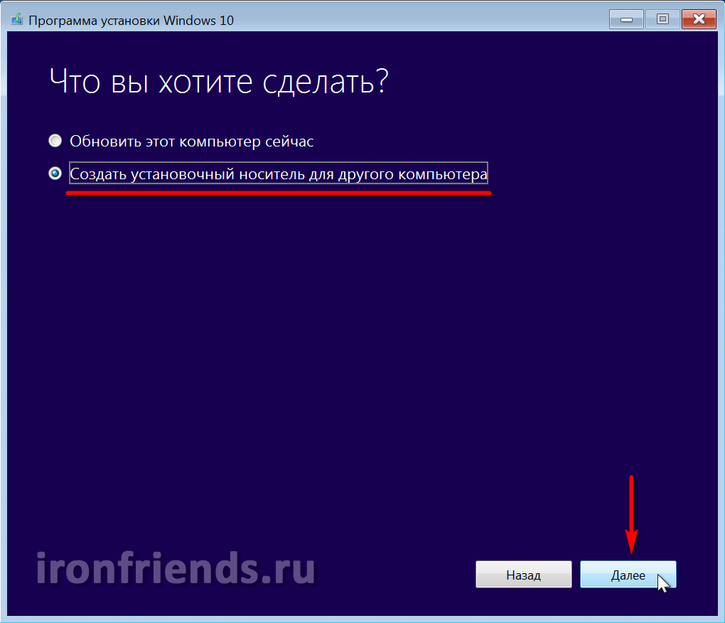 Пункт «Обновить этот компьютер сейчас» предназначен для обновления уже установленной у вас операционной системы Windows 7 или Windows 8.1. Но всегда лучше производить чистую установку с диска или флешки. Для этого нужно выбрать пункт «Создать установочный носитель для другого компьютера».