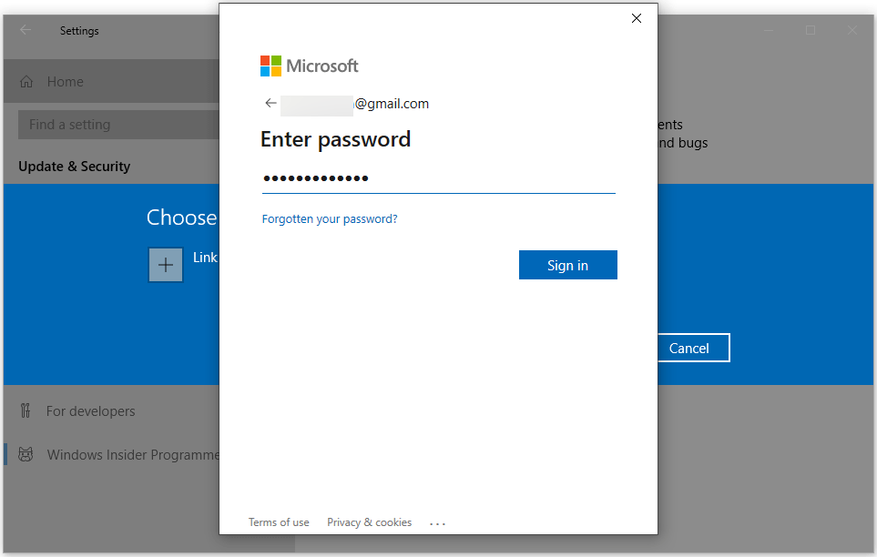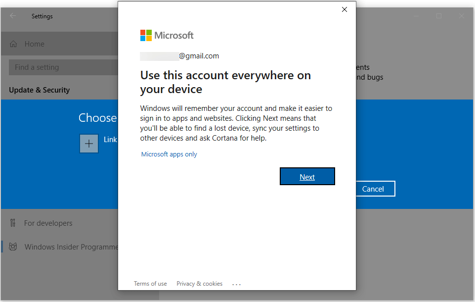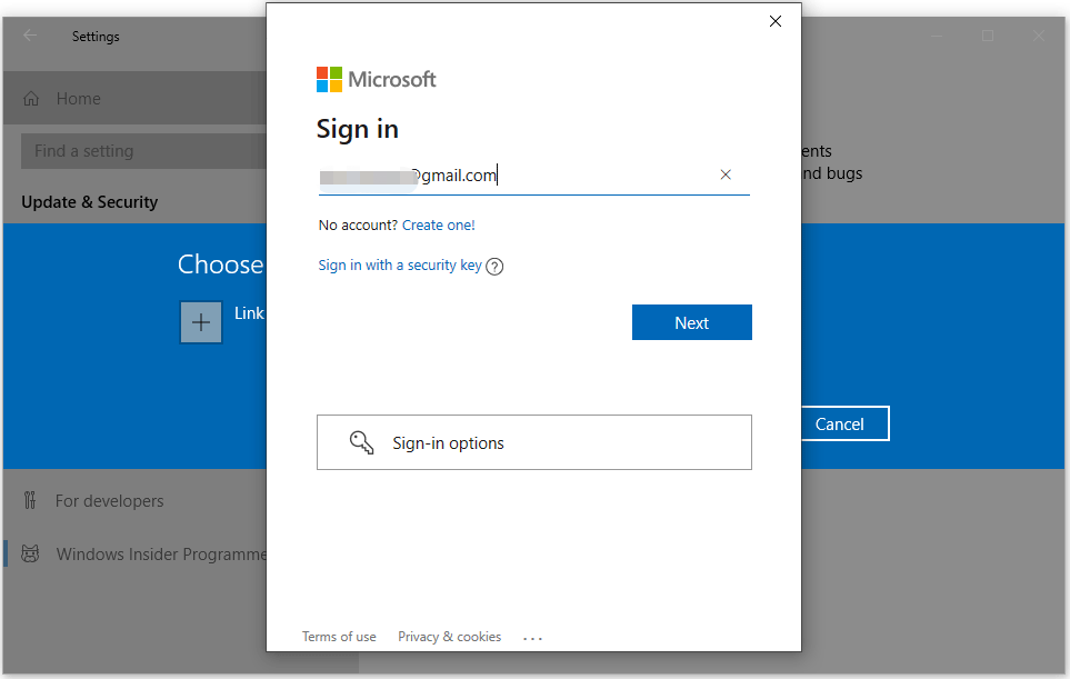 On the Let’s add your Microsoft account page, you can sign in with your Microsoft account or even create a new account. This account is your Windows Insider account that you typically use to test the preview builds. Enter the account and complete the sign-in process.