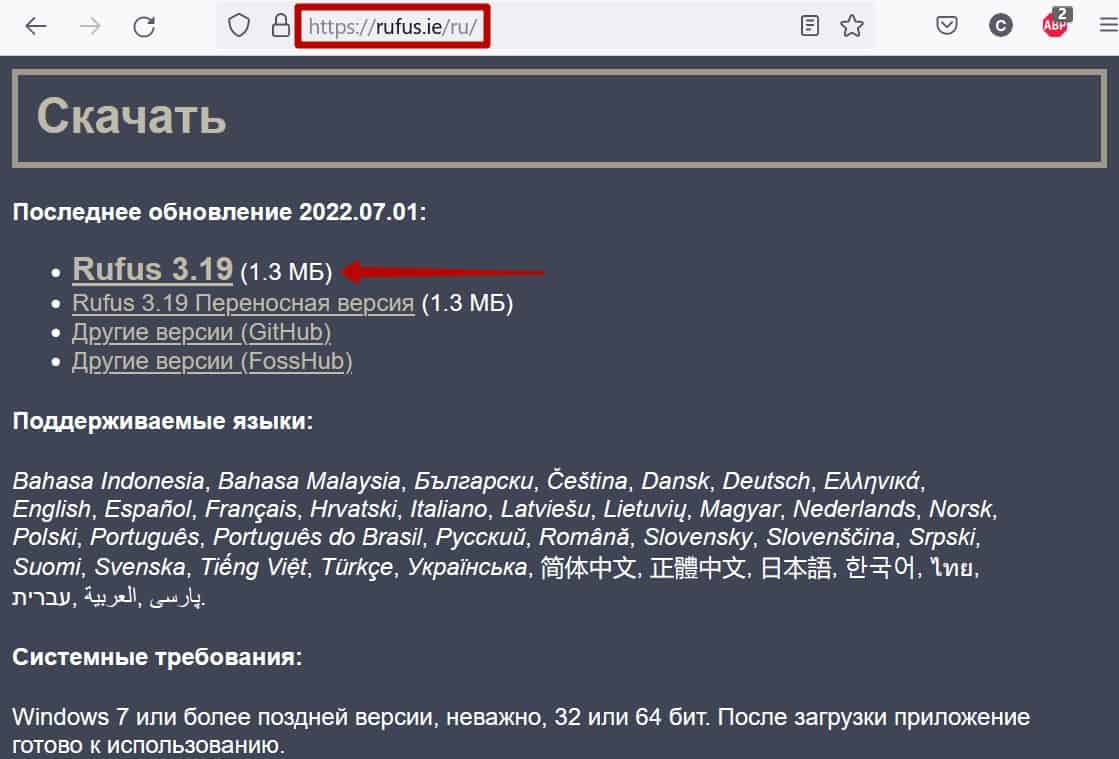 После загрузки образа OS удобно записать установочный USB-диск. Задачу решает приложение Rufus. Это бесплатная программа для создания загрузочного диска из ISO-образа. Утилита работает без инсталляции.