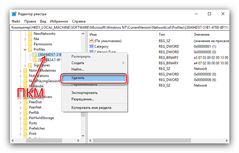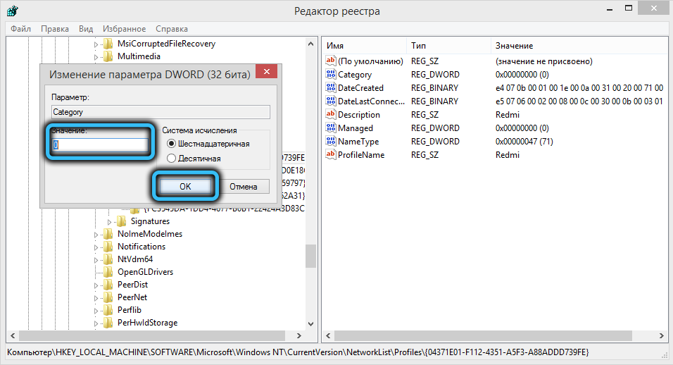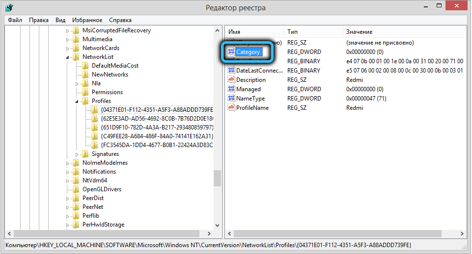 Проверьте свое сетевое имя в строке реестра ProfileName. Тип сети указывается в параметре Category. Доступны следующие значения: