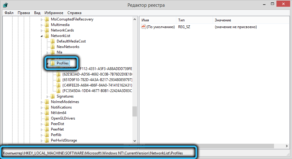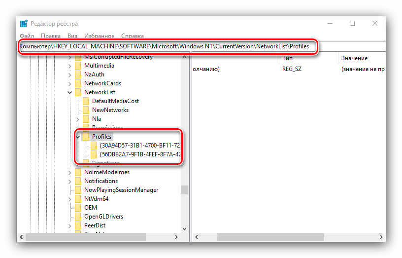 В открывшемся реестре перейдите по пути «HKEY_LOCAL_MACHINE/SOFTWARE/Microsoft/Windows NT/CurrentVersion/NetworkList/Profiles».