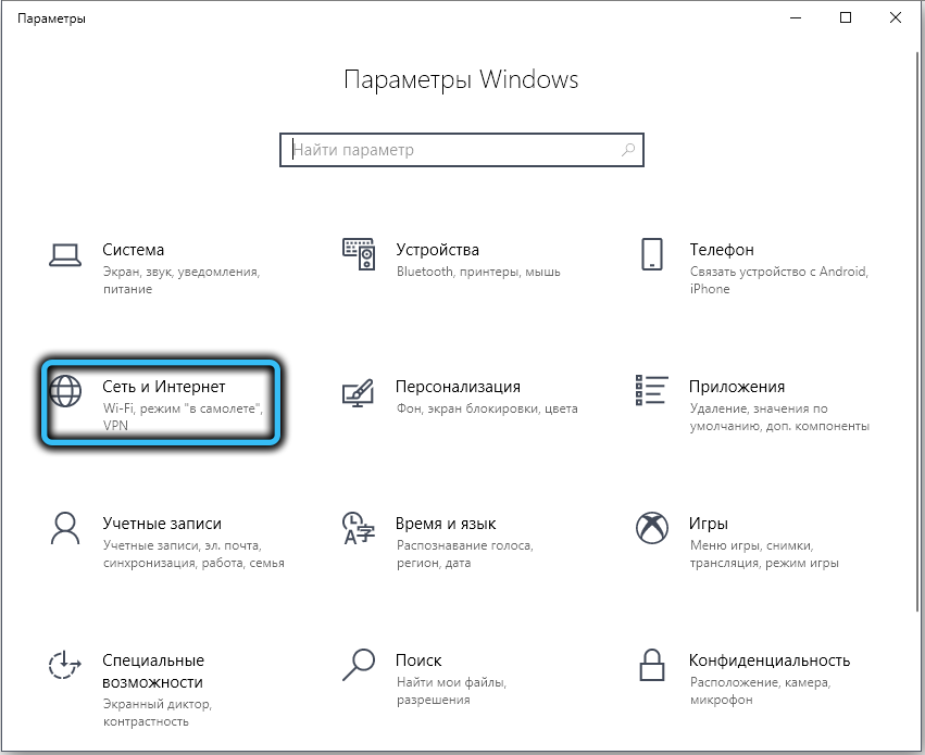 - Вернитесь в настройки Windows и выберите раздел «Сеть и интернет».