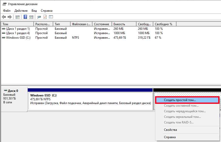 Выберите диск с неразмеченной областью и, вызвав контекстное меню, выберите команду «Создать простой том».