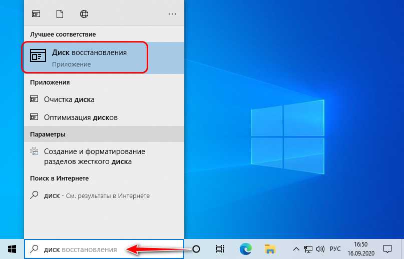Диск восстановления создаётся средствами самих операционных систем. Процесс создания одинаков в обоих системах, в системный поиск вписываем «диск восстановления» и запускаем приложение. В Windows 10 это выглядит вот так.