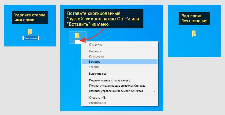 Теперь вначале удалите старое название, затем горячими клавишами вы вставите скопированный ранее невидимый символ. И, нажав Enter или просто кликнув мышью в сторону от папки, ее имя полностью пропадет.