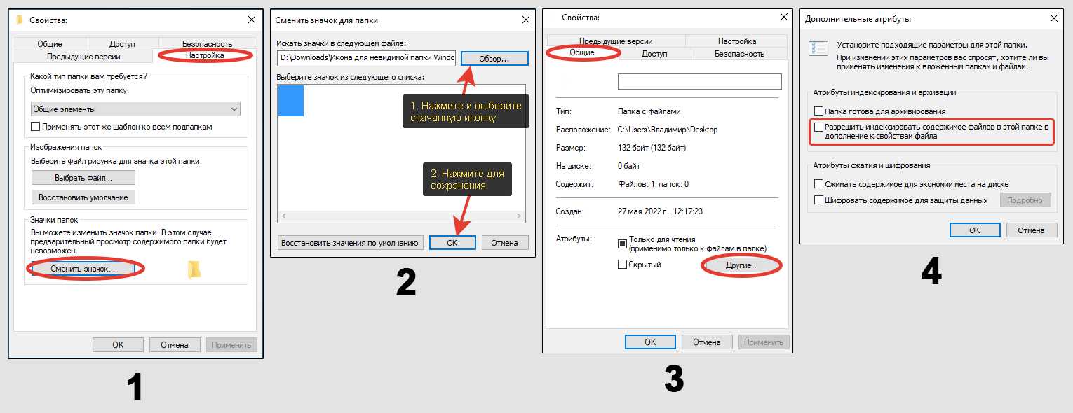 В результате вы получите полностью невидимую папку (не забудьте скрыть и ее название), но при банальном выделении с помощью мышки ее все же можно будет заменить.