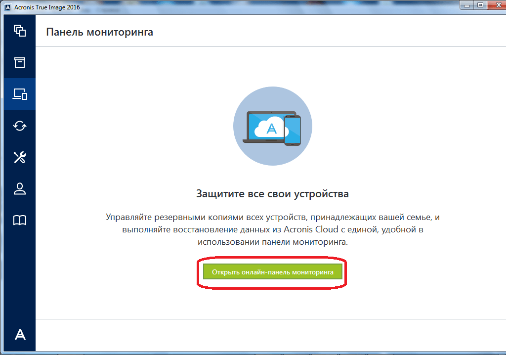 Со стартовой страницы Acronis True Image переходим в раздел под названием «Панель мониторинга».