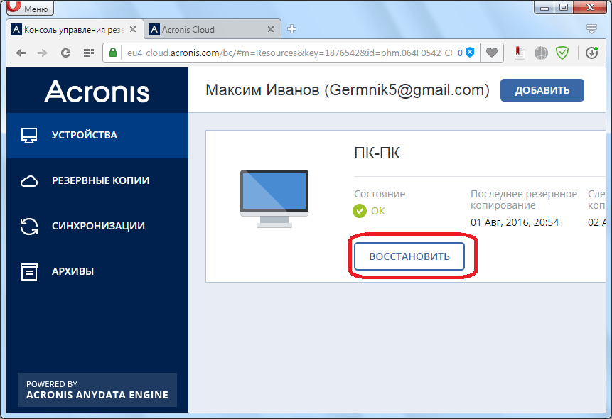После этого, запускается браузер, который установлен в Вашем компьютере по умолчанию. Браузер перенаправляет пользователя на страницу «Устройства» в его учетной записи в Acronis Cloud, на которой видны все резервные копирования. Для того, чтобы восстановить резервную копию, достаточно просто нажать на кнопку «Восстановить».