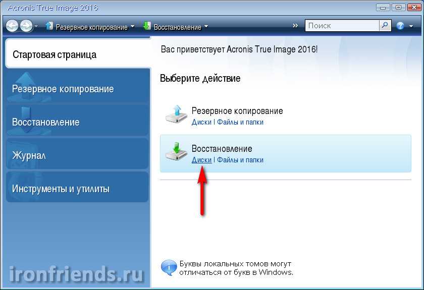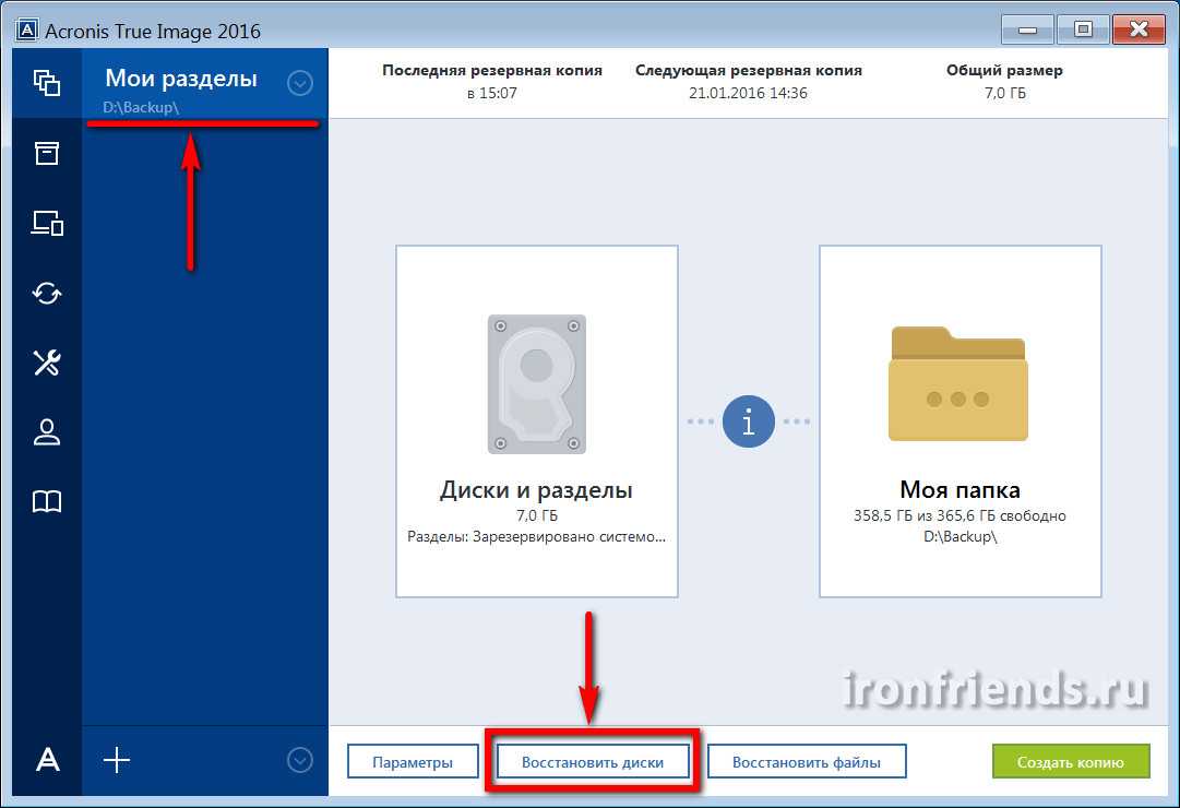 Если компьютер загружается, то восстановление системы можно запустить из-под Windows. Для этого выберите резервную копию и нажмите кнопку «Восстановить диски».