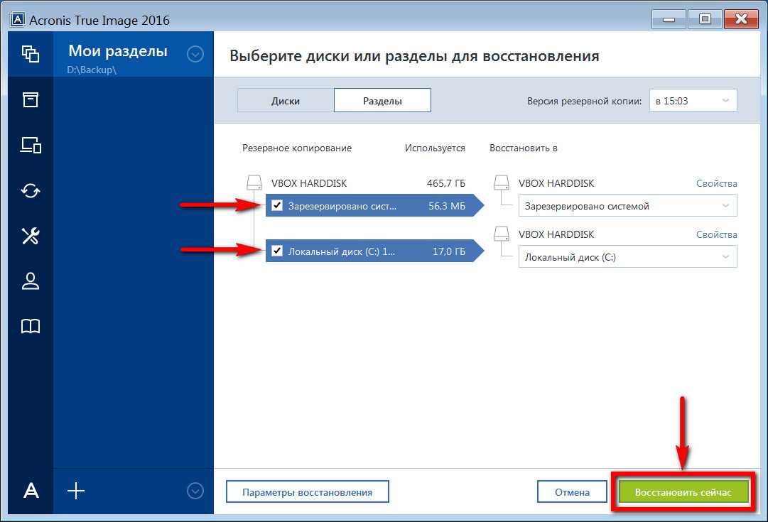 Выберите галочками все разделы из резервной копии и нажмите «Восстановить сейчас».