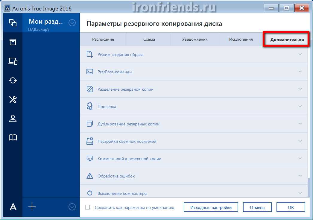 Остальные настройки касаются в основном периодического резервного копирования и резервного копирования по расписанию. Подробное описание всех параметров программы Acronis True Image вы можете скачать в разделе «Ссылки».