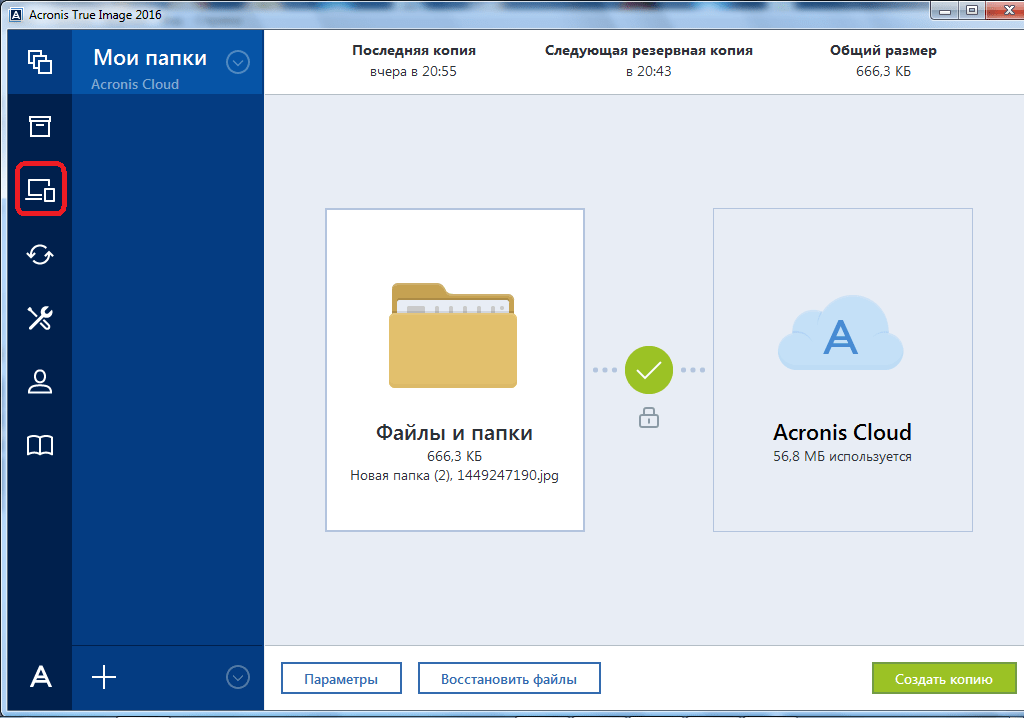 После того, как резервная копия данных была загружена на сервер Acronis Cloud, ею можно управлять с помощью Панели мониторинга. Тут же имеется возможность управлять и синхронизациями.