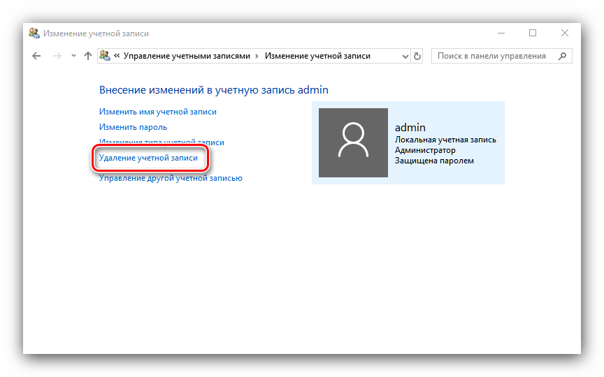 Этот способ удаления ненужной учётной записи рассчитан на опытных пользователей. Поэтому система не переспрашивает их о намерениях и не предупреждает о возможных негативных последствиях производимых действий.