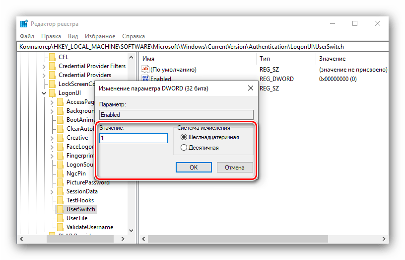 Добавление учетной записи виндовс 10 произошло, но система автоматически входит первой записью, и не хочет переключаться. Такая проблема появляется, если отключена функция смены записей. В тогда она активируется в редакторе реестра: