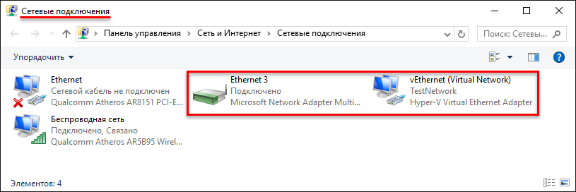 Виртуальный сетевой адаптер создан. Результат добавления виртуального коммутатора в Hyper-V на физической машине можно увидеть в окне “Сетевые подключения”, в результате был создан сетевой мост и виртуальный адаптер.