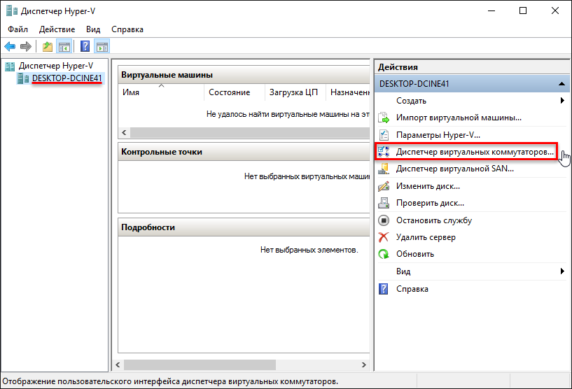 Настройка доступа к сети в диспетчере Hyper-V настраивается отдельно. Для этого в диспетчере Hyper-V слева в списке выберите пункт с именем вашего компьютера, и в правой части окна выберите Диспетчер виртуальных коммутаторов…