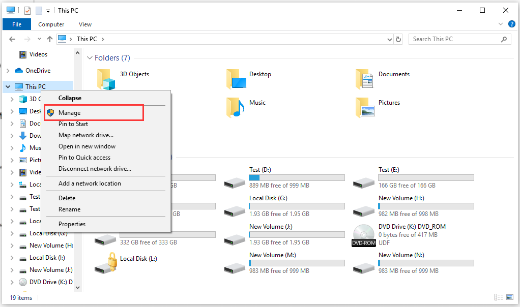 Step 1. Open your Windows File Explorer, then right-click on My Computer (Windows 7) or This PC (Windows 10/8) and select Manage.