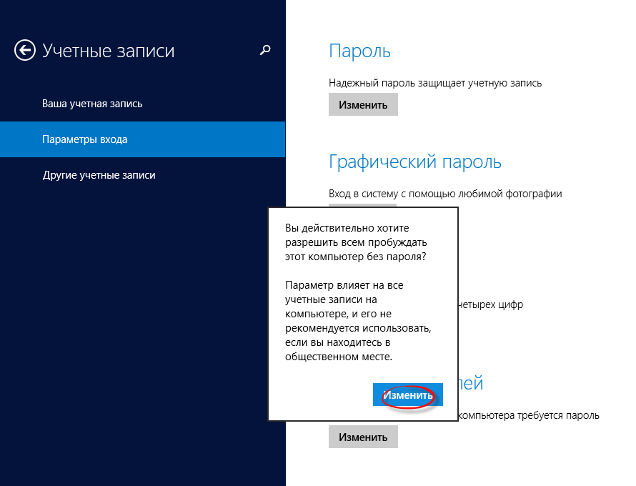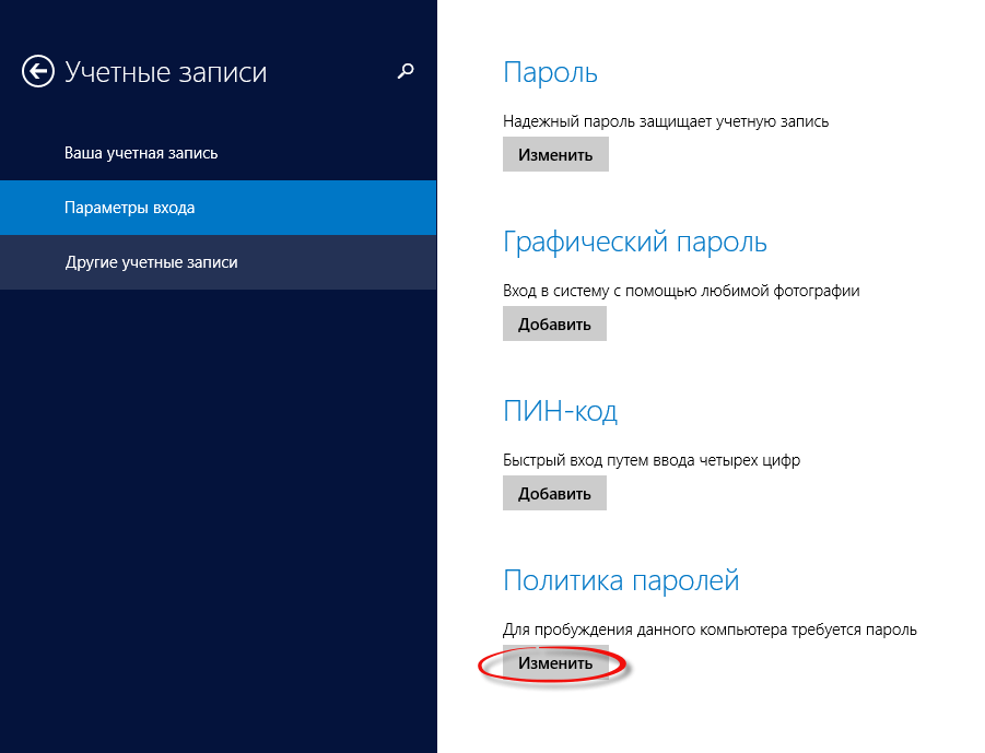 Некоторым пользователям не нравится еще и то, что после вывода из сна, также требуется ввод данных. В системе есть опция, которая позволит будить компьютер без лишних действия. Для начала, пользователю потребуется зайти в Параметры, оттуда пройти в изменение параметров компьютера, дальше в параметры ПК, из них нужно зайти в учетные записи, где следует выбрать параметры входа. В этом разделе потребуется открыть политику паролей и нажать на Изменить, в открывшемся окне стоит отметить пункт «Для пробуждения компьютера не требуется пароль».