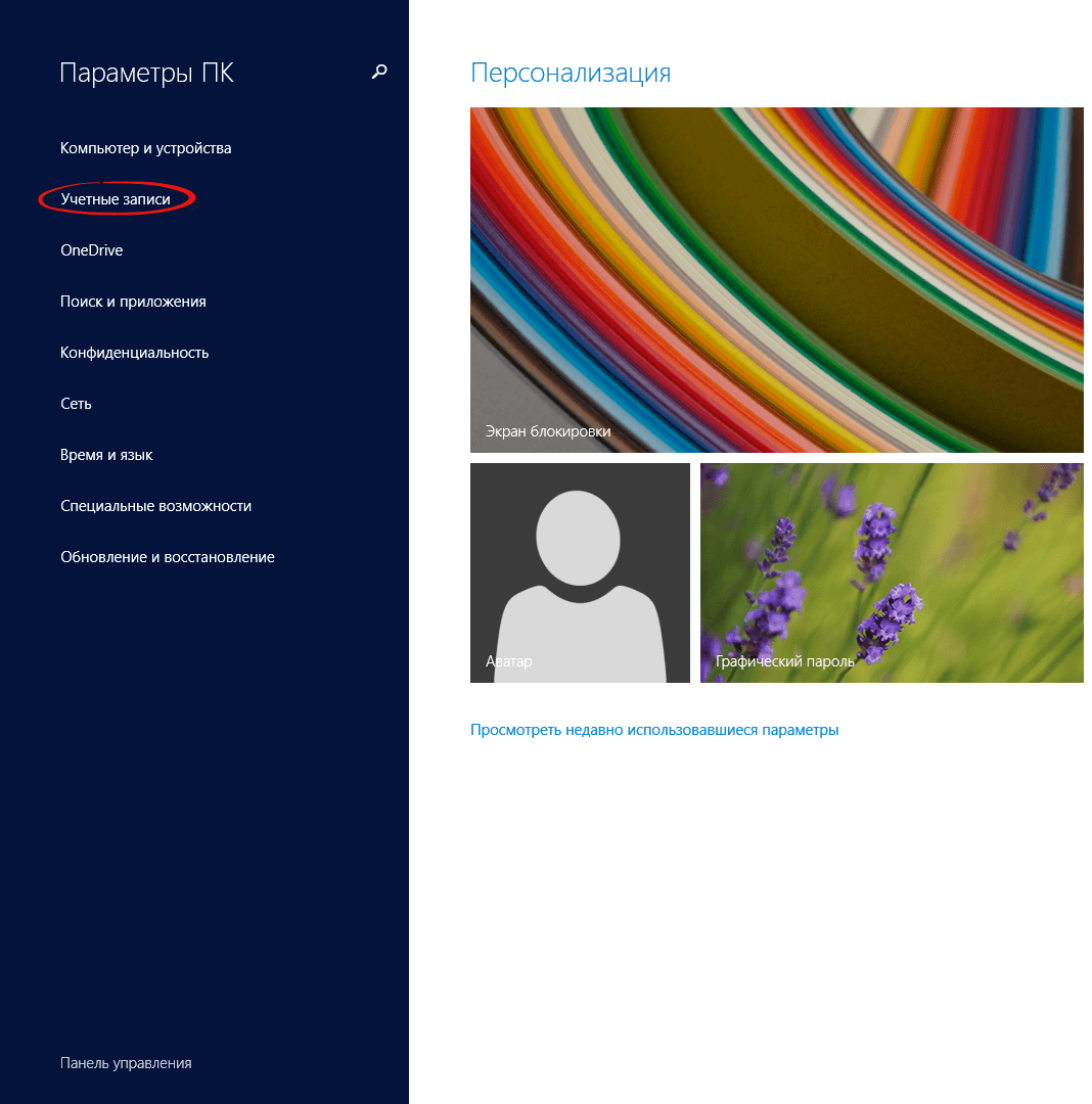 - В правой боковой панели нажмите «Параметры» (значок в виде шестерёнки) → «Изменение параметров компьютера». В меню открывшегося окна выберите «Учётные записи» (или «Пользователи»), а затем «Параметры входа».