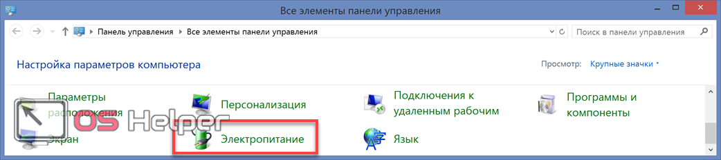 - В строке поиска в Windows введите «Электропитание» и кликните по найденной ссылке на раздел с таким же названием. Или найдите его вручную через «Панель управления».