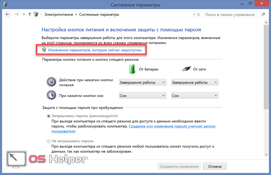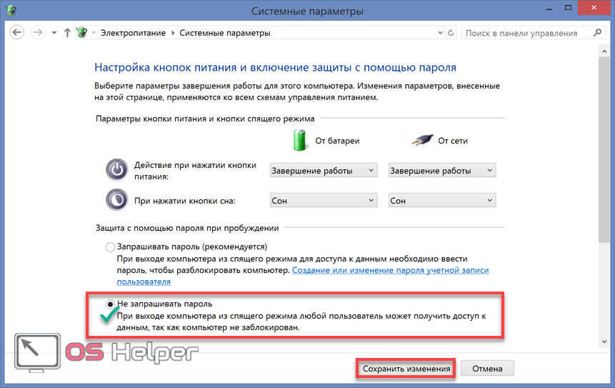 - Нажмите «Запрос пароля при пробуждении», затем «Изменение параметров, которые сейчас недоступны» и отметьте флажком опцию «Не запрашивать пароль».
