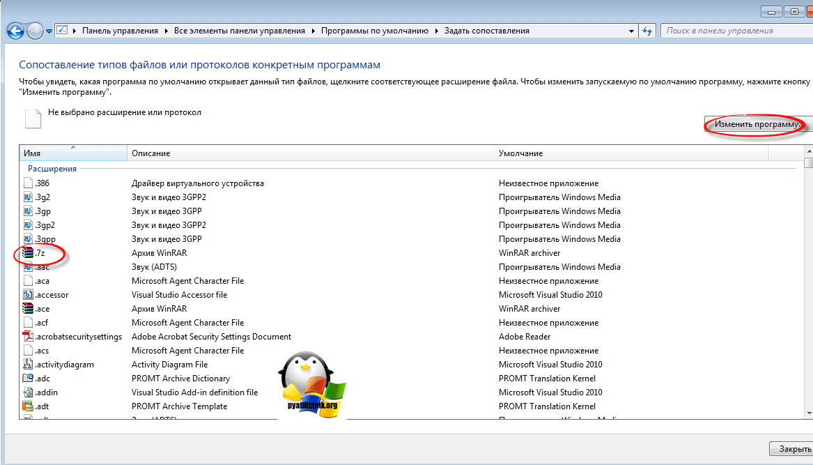 В открывшемся окне вы получите полный список расширений и протоколов известных Windows 7. Например есть формат .7z это архивный формат, допустим я хочу изменить утилиту, которая будет его открывать, проще говоря сменить ассоциацию, для этого в верхнем правом углу жмем кнопку Изменить программу.
