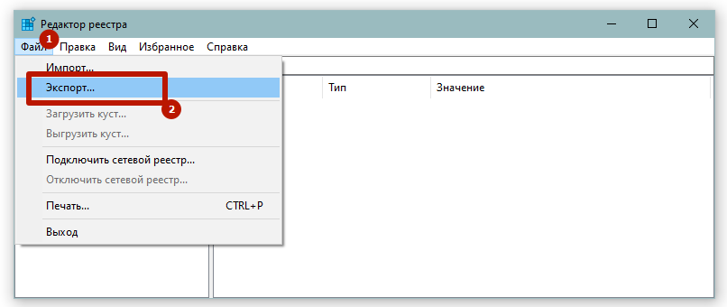 - В окне программы на панели инструментов кликаем по кнопке «Файл/Экспорт» и сохраняем копию файлов реестра на рабочем столе на всякий случай.