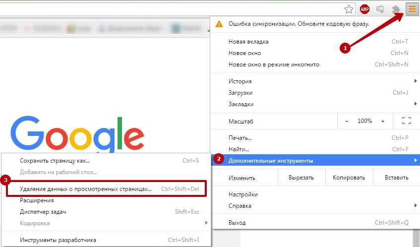 - Выберите пункт «Дополнительные инструменты», а затем пункт «Удаление данных о просмотренных страницах». Либо используйте сочетание клавиш Ctrl+Shift+Del.