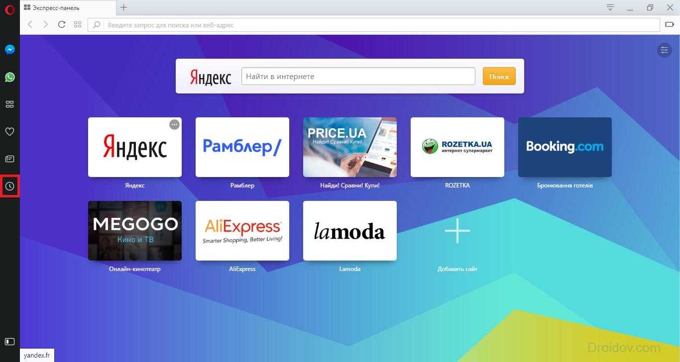 Необходимо воспользоваться меню, которое в крайней версии браузера перекочевало в левую часть экрана. Чтобы открыть историю посещений просто нажимаем на соответствующую вкладку.
