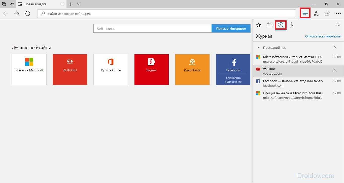 - Либо нажмите кнопку «Меню», которая находится в правом верхнем углу, выберите пункт «История», затем снова «История».