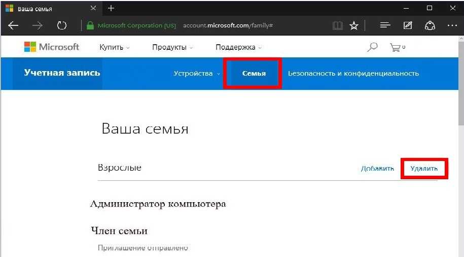 Удобно это или нет – решать пользователю, но кнопка «удалить» появится напротив профиля только после того, как учётка удалится непосредственно из аккаунта Microsoft администратора компьютера. Там надо зайти в раздел «Семья» и выбрать меню удаления.
