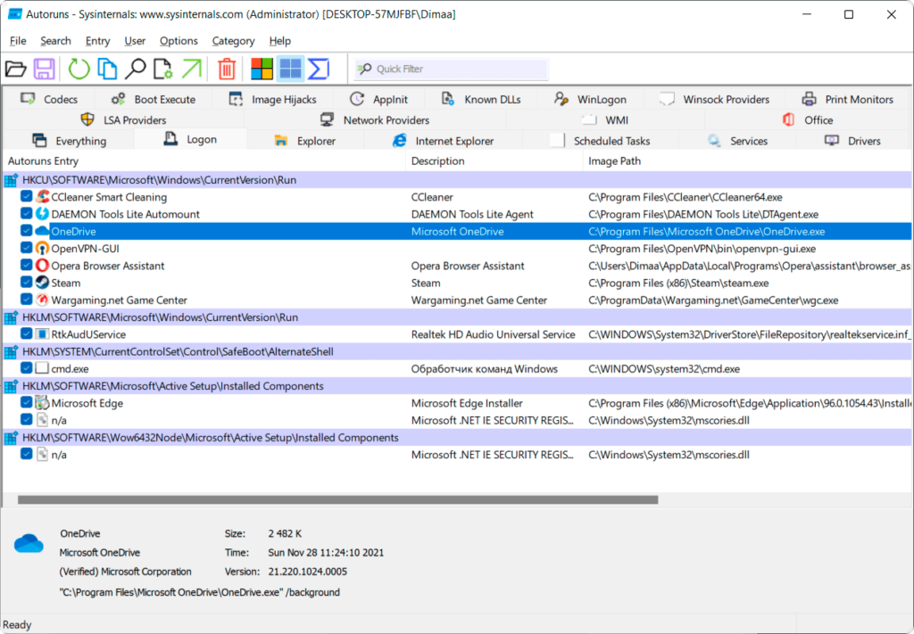 Бонус. Не стоит забывать небольшое приложение AutoRuns. Во вкладке Everything отображаются все программы, запланированные задачи, службы и даже драйвера устройств. Во вкладке Logon показываются только те приложения, которые запускаются при входе в профиль Windows 11.