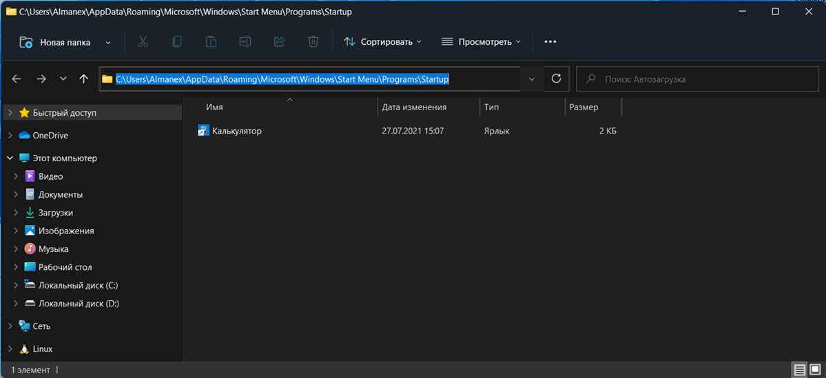 Простейший способ указать системе, чтобы она запускала программу при старте — размещение ярлыка приложения, исполнимого EXE-файла (или любого файла вообще) в папке «Автозагрузка». В предыдущих версиях Windows ее можно было найти в меню «Пуск», но сейчас ее там нет (по крайней мере, на момент написания статьи). Потому открываем ее самостоятельно путем копирования в адресную строку «Проводника» следующего адреса (после — нажимаем «Enter»):