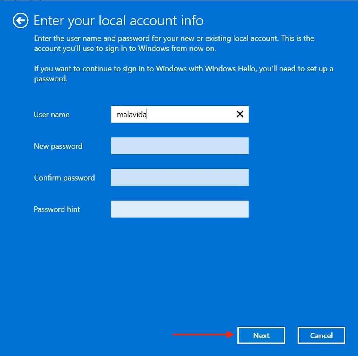 - Введите имя пользователя и пароль (не обязательно) — они могут совпадать с теми, что у вас были при использовании учётной записи Майкрософт. Необходимость ввода обусловлена тем, что теперь эти данные будут храниться локально. Нажмите «Далее».